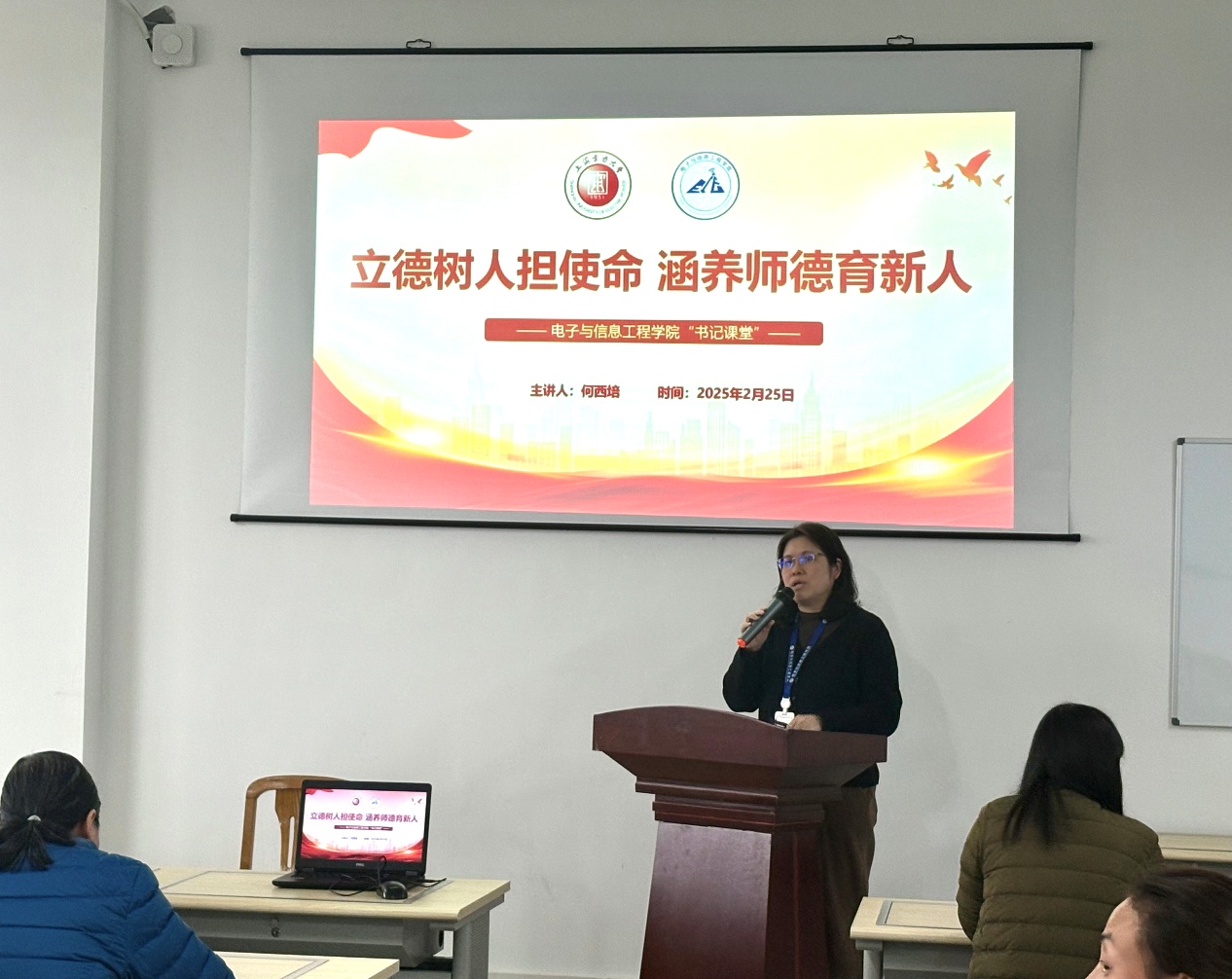 2月25日,何西培在全體教職工大會上以“立德樹人擔使命,涵養師德育新人”為主題作“書記課堂”,帶領大家集體學習《上海電力大學教職工考核辦法》《上海電力大學師德師風考核實施方案》,并結合教育部公開曝光違反教師職業行為十項準則典型案例,深入剖析了師德失范行為的危害性,指出師德師風建設是學院高質量發展的生命線,必須常抓不懈。她強調,全體教職工要以案為鑒,時刻保持警醒,切實增強師德修養,堅守師德底線,真正做到心有所畏、言有所戒、行有所止,以更高的道德標準要求自己,堅守教育初心,牢記為黨育人、為國育才使命,將師德師風建設融入教育教學全過程,提高政治站位,強化責任擔當。同時號召全體教職工以飽滿的熱情投入新學期工作,以實際行動強化自身師德師風建設,大力弘揚教育家精神,上好每一堂課,教好每一個學生,主動更新思維方式,適應教育變革,將立德樹人根本任務落實在教育教學中。