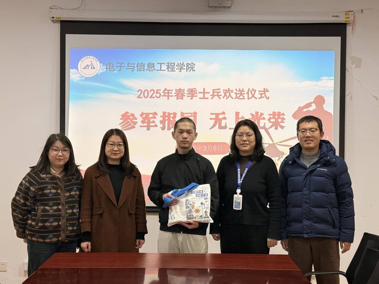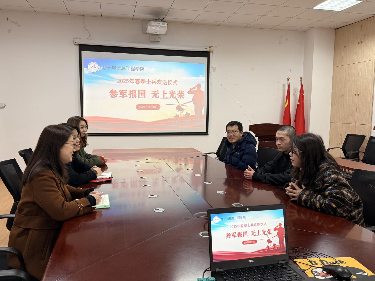 熱血新啟程,書寫新篇章。近日,電信學院舉行2025年春季預定新兵歡送會,學院黨委書記何西培、黨委副書記周冬梅,學院征兵專項工作負責人阮文杰,輔導員黃燕、劉姝與春季預定新兵參會。