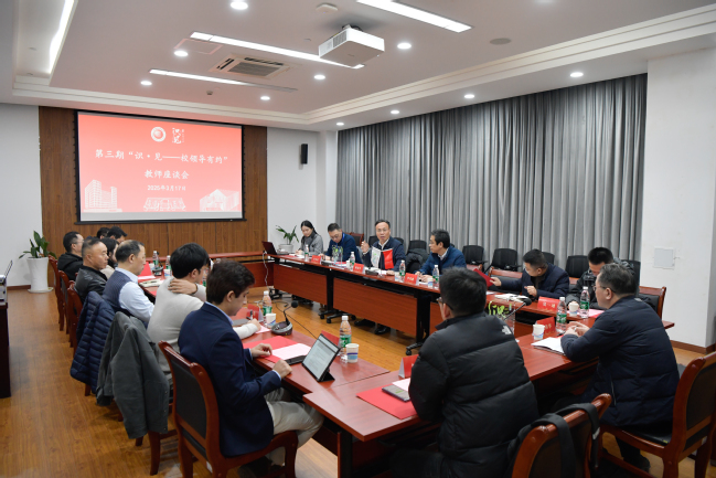 3月17日下午,我校第三期“識·見——校領導有約”教師座談會在臨港校區學術樓105會議室召開。校黨委副書記、校長顧春華出席,校長辦公室主任李兆鵬,教工部部長、人事處處長李永斌與會,校國家級、省部級人才代表與會。會議由李永斌主持。