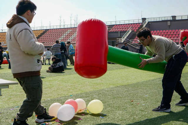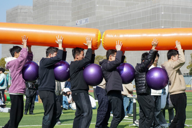 本次運(yùn)動會精心設(shè)置了多個趣味項目,這些項目都將團(tuán)隊協(xié)作精神體現(xiàn)得淋漓盡致。貪吃蛇挑戰(zhàn)、車輪滾滾、雷霆戰(zhàn)鼓、快樂大錘與百發(fā)百中,五個項目各具特色,既考驗同學(xué)們的個人能力,又鍛煉團(tuán)隊分工意識與相互之間的磨合。通過這些趣味運(yùn)動,同學(xué)們在歡聲笑語中釋放壓力,增強(qiáng)班級凝聚力,收獲快樂與成長。其中,雷霆戰(zhàn)鼓與貪吃蛇挑戰(zhàn)作為兼具雙重能力考察的項目尤有難度,雷霆戰(zhàn)鼓需要觀察掌握顛球落點與平衡挪動步頻的訣竅。在貪吃蛇挑戰(zhàn)中由于“身高差”原因也為此項運(yùn)動帶來難度,但齊心協(xié)力最后抵達(dá)終點時同學(xué)們更加體會團(tuán)結(jié)的重要。