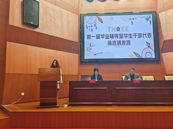 新一屆學業輔導室干部代表、網絡宣傳部部長徐志清發言,她表示將積極履行職責,認真工作的態度和決心;學風專項負責教師孫攀峰傳達布置新學期院內各項學風工作安排,強調重點學風工作任務和要求。