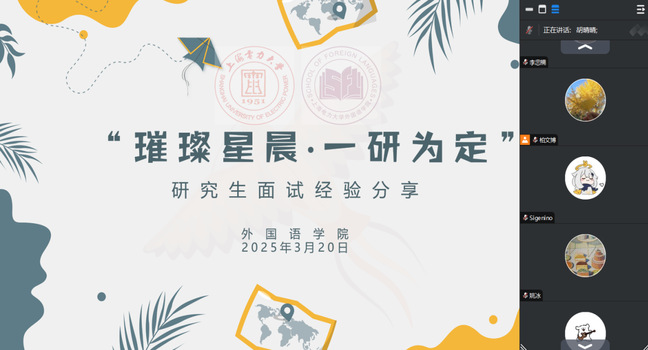 為扎實推進“致遠計劃”行動方案,助力2025屆考研學子明確方向、把握重點、堅定信心,從容應對研究生復試與調劑,3月20日,外國語學院在線上舉行“璀璨星晨,一‘研’為定”考研面試指導會。外國語學院副院長陳宗利,2023屆畢業生、上海師范大學在讀翻譯碩士胡晴晴擔任主講,學院全體考研學生及2022級學生參會。會議由學院就業聯絡人柏文博主持。
