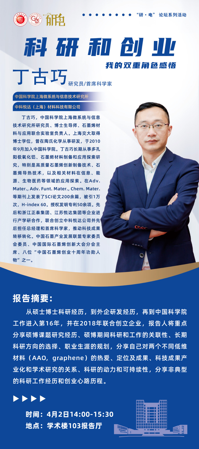 主講人簡介:丁古巧,中國科學院上海微系統與信息技術研究所研究員、博士生導師、石墨烯材料與應用聯合實驗室負責人。上海交大取得博士學位,曾在陶氏化學從事研發,于2010年9月加入中國科學院。丁古巧長期從事多孔陽極氧化鋁、石墨烯材料制備和應用探索研究,特別是高質量石墨烯創新制備技術、石墨烯導熱技術,以及相關材料在信息、能源、生物醫藥等領域的應用探索。在Adv. Mater., Adv. Funt. Mater., Chem. Mater.等期刊上發表了SCI論文200余篇,被引1萬次,H-index 60。授權發明專利50余項。先后和浙江正泰集團、江蘇悅達集團等企業進行產學研合作,聯合創立中科悅達公司并先后擔任總經理和首席科學家,推動科技成果轉移轉化。中國石墨產業發展聯盟專家委員會委員、中國國際石墨烯創新大會分會主席、八位“中國石墨烯創業十周年功勛人物”之一。